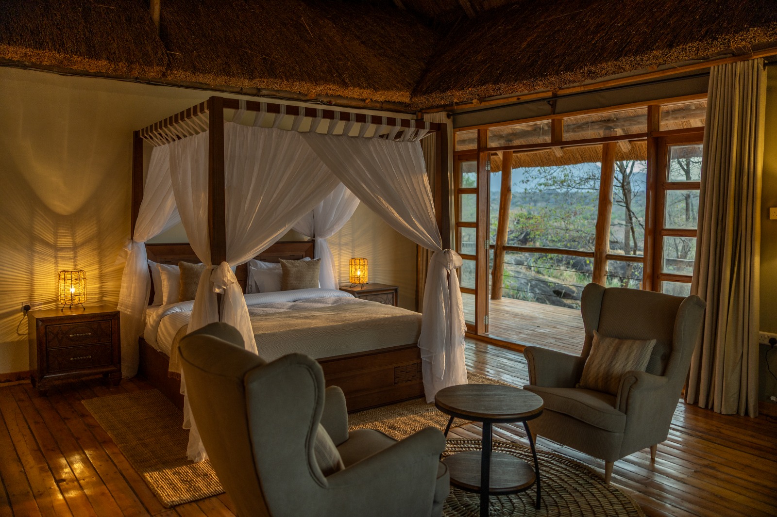 The Charlets , with thatched roofs and large, mesh-screened windows, provide the perfect opportunity to connect with the sights and sounds of Kidepo Valley National Park .